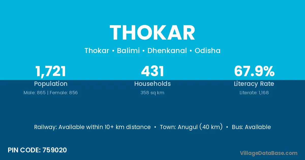 Anugul (40 km) is the nearest town to Thokar village for major economic activities and is located approximately 40 km away.