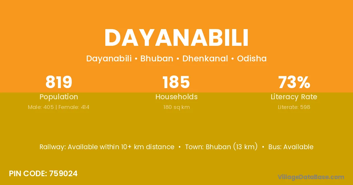 Bhuban (13 km) is the nearest town to Dayanabili village for major economic activities and is located approximately 13 km away.