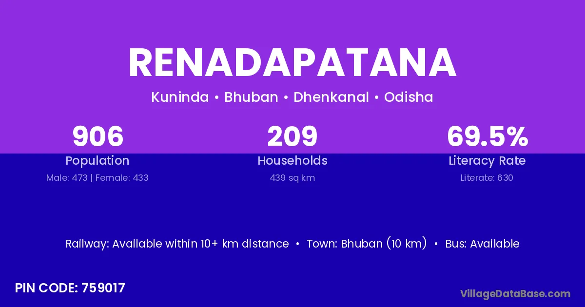 Bhuban (10 km) is the nearest town to Renadapatana village for major economic activities and is located approximately 10 km away.