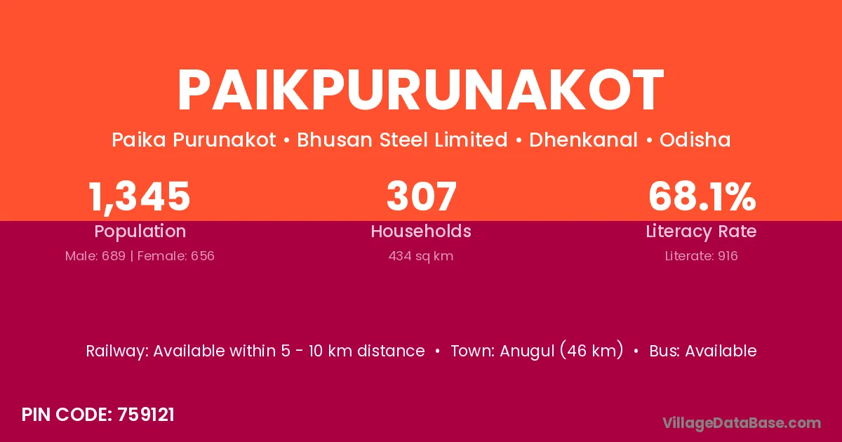 Anugul (46 km) is the nearest town to Paikpurunakot village for major economic activities and is located approximately 46 km away.