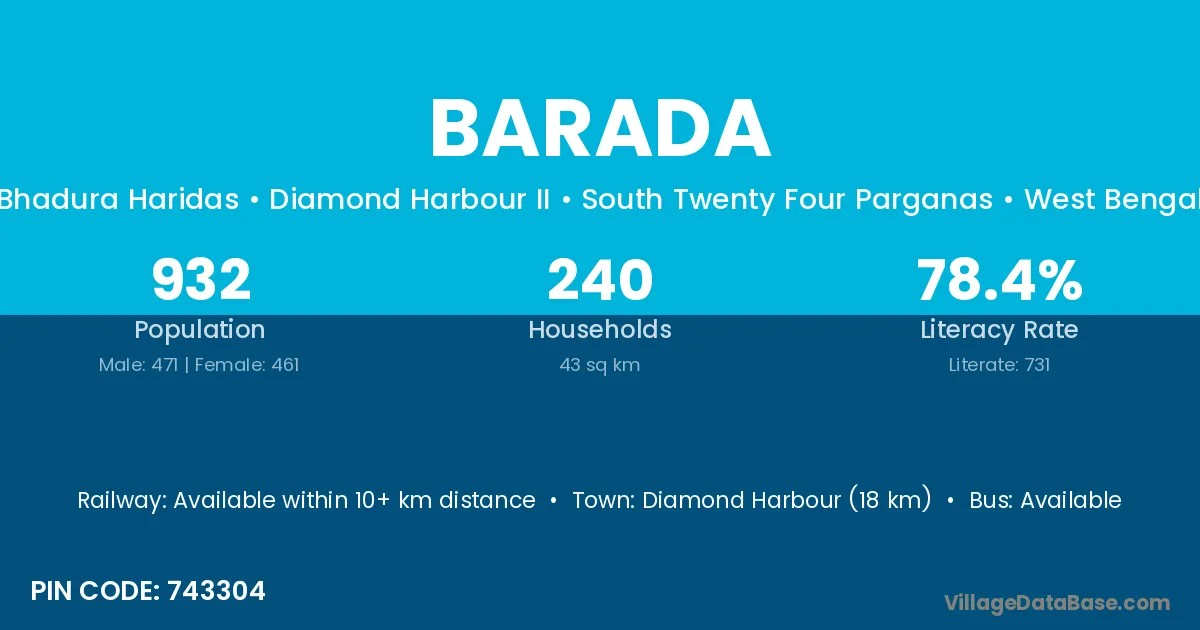 The literacy rate of Barada village is 77.98%. Male literacy stands at 83.73% and female literacy at 70.60%.