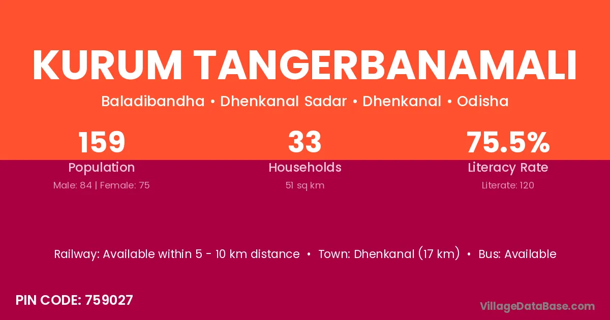 Dhenkanal (17 km) is the nearest town to Kurum Tangerbanamali village for major economic activities and is located approximately 17 km away.