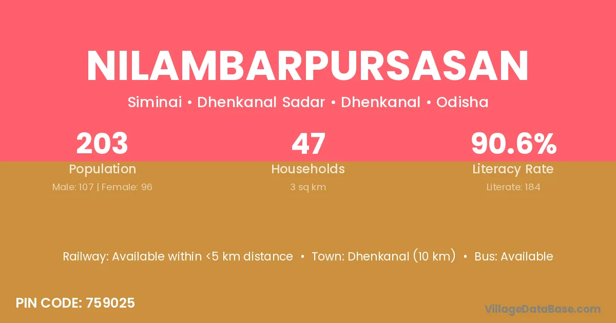 Dhenkanal (10 km) is the nearest town to Nilambarpursasan village for major economic activities and is located approximately 10 km away.