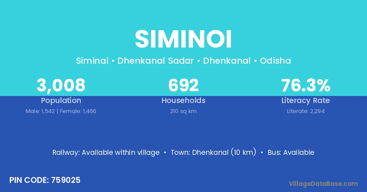 Dhenkanal (10 km) is the nearest town to Siminoi village for major economic activities and is located approximately 10 km away.