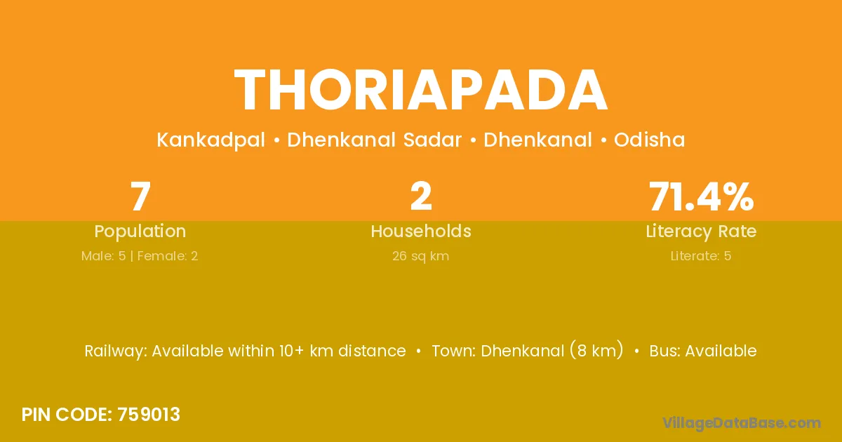 Dhenkanal (8 km) is the nearest town to Thoriapada village for major economic activities and is located approximately 8 km away.