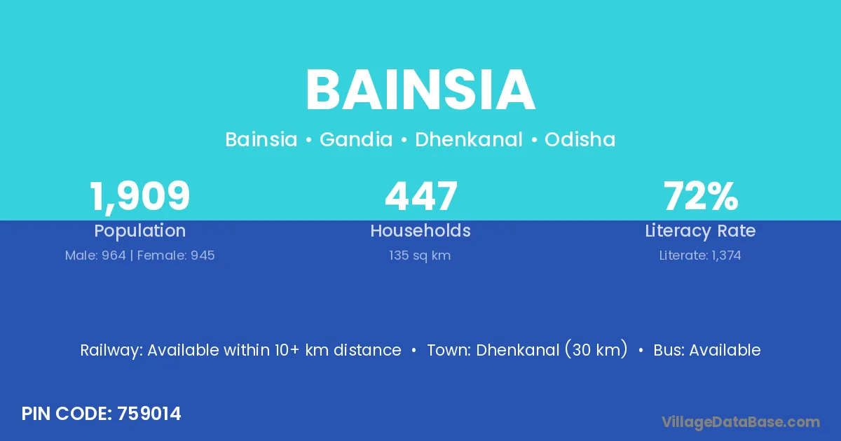 Dhenkanal (30 km) is the nearest town to Bainsia village for major economic activities and is located approximately 30 km away.
