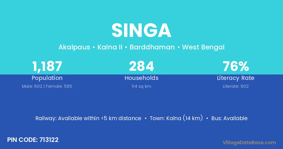 Dhenkanal (32 km) is the nearest town to Singa village for major economic activities and is located approximately 32 km away.