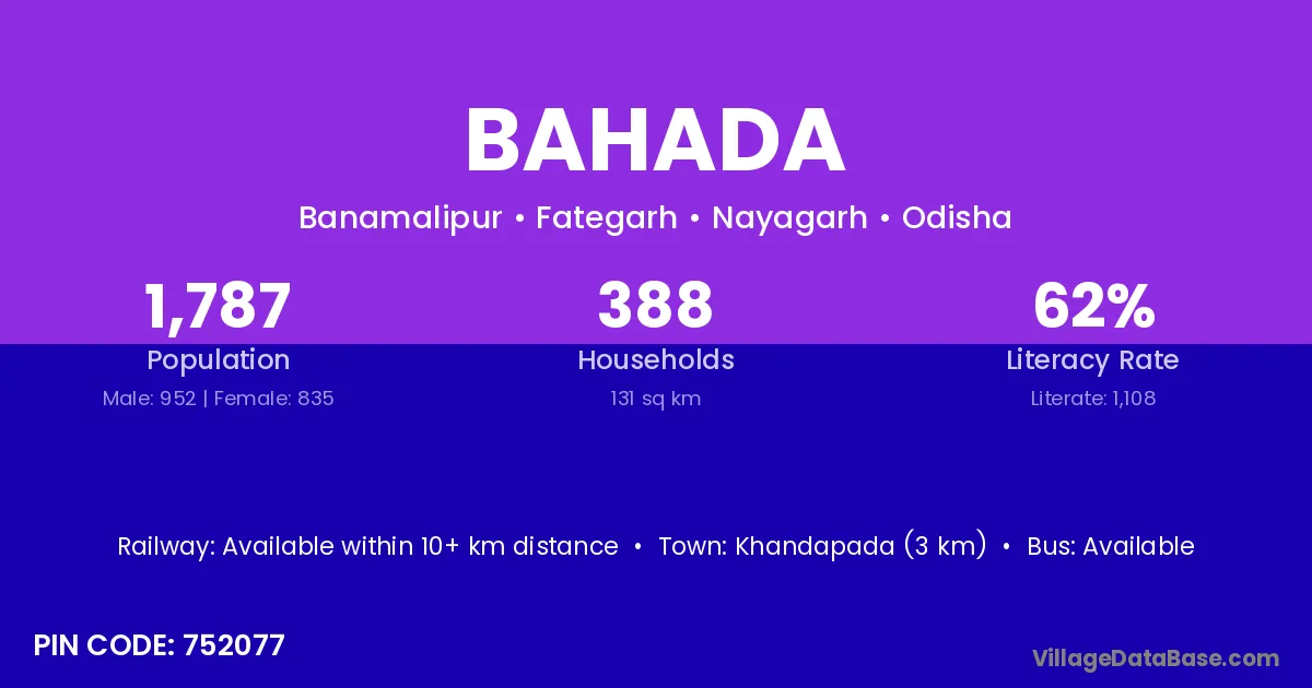 Kamakshyanagar (6 km) is the nearest town to Bahada village for major economic activities and is located approximately 6 km away.