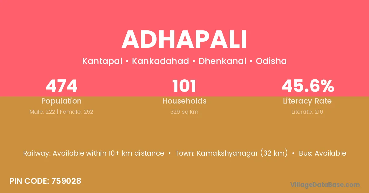 Kamakshyanagar (32 km) is the nearest town to Adhapali village for major economic activities and is located approximately 32 km away.