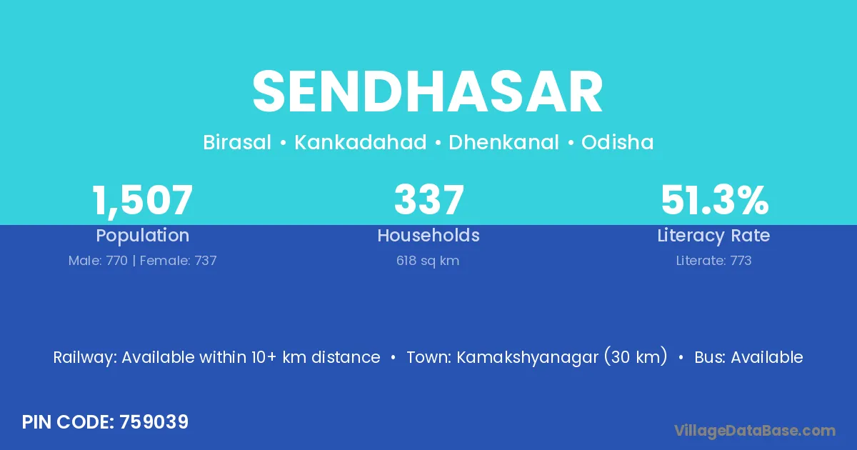Kamakshyanagar (30 km) is the nearest town to Sendhasar village for major economic activities and is located approximately 30 km away.