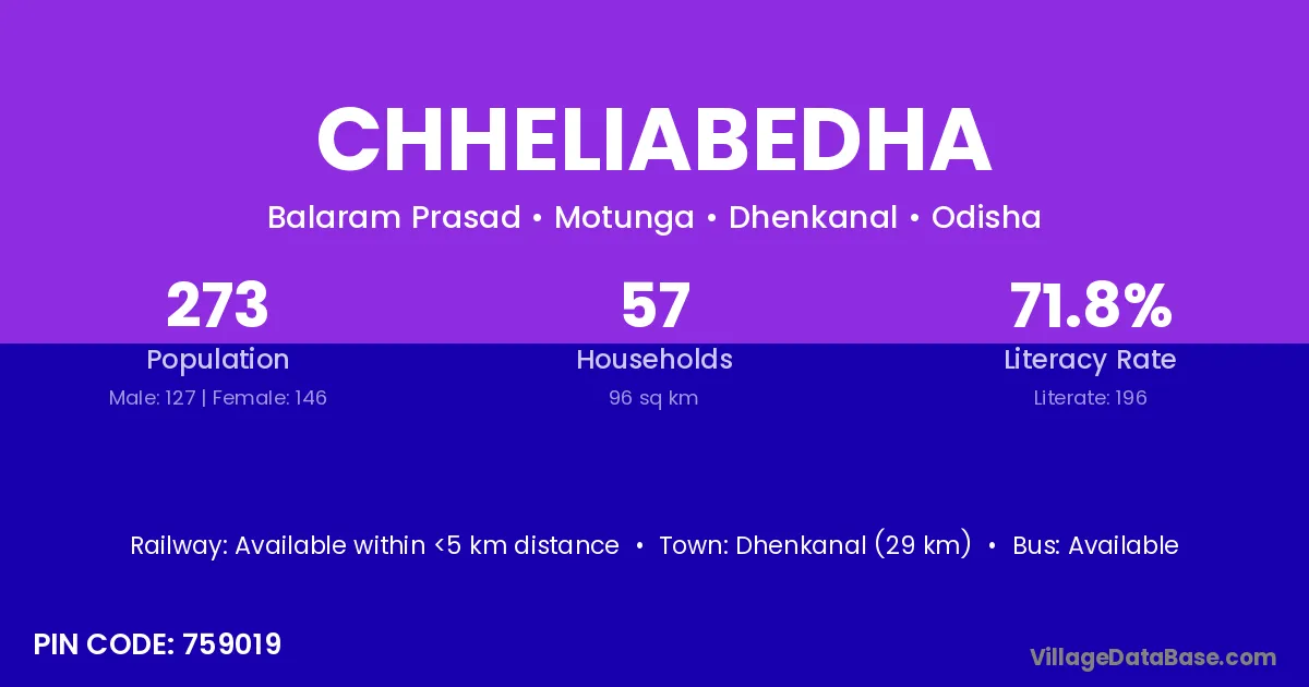 Dhenkanal (29 km) is the nearest town to Chheliabedha village for major economic activities and is located approximately 29 km away.