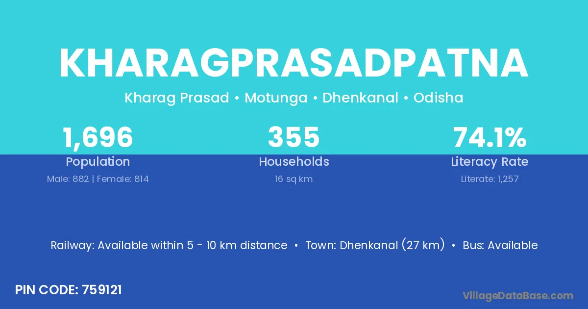 Dhenkanal (27 km) is the nearest town to Kharagprasadpatna village for major economic activities and is located approximately 27 km away.
