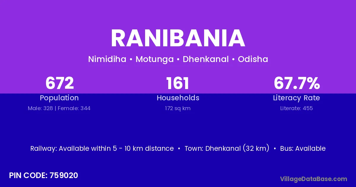 Dhenkanal (32 km) is the nearest town to Ranibania village for major economic activities and is located approximately 32 km away.
