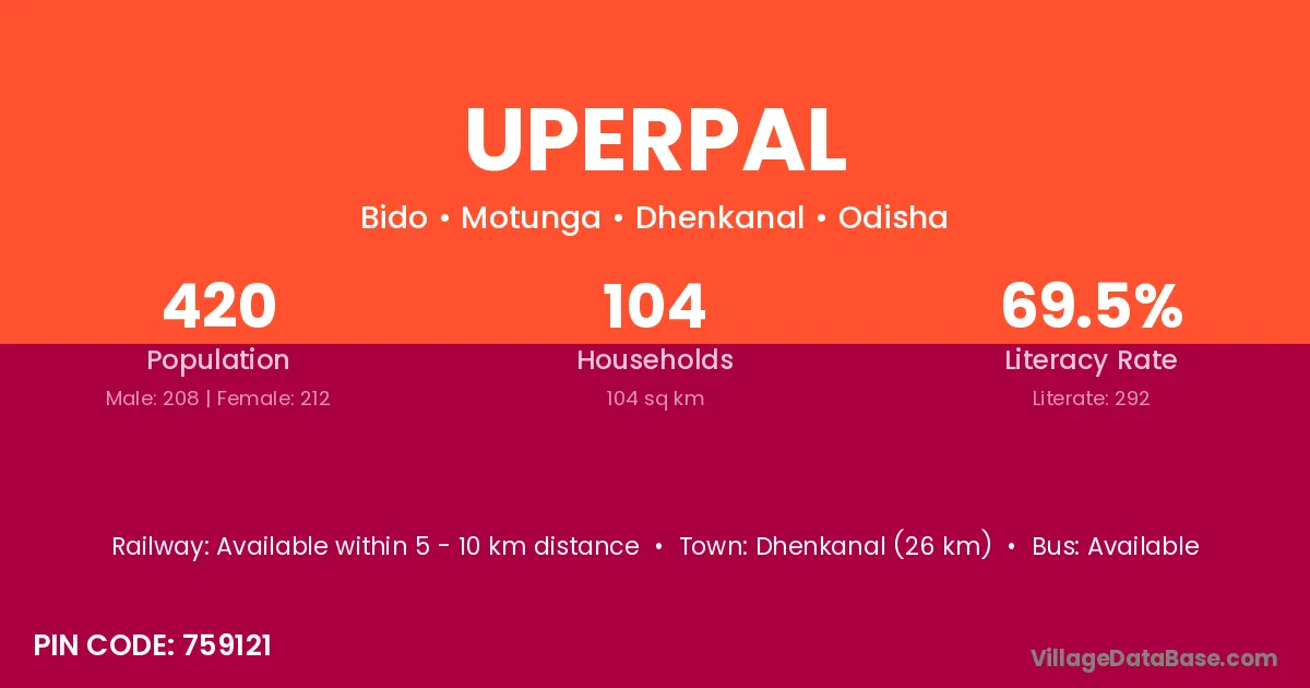 Dhenkanal (26 km) is the nearest town to Uperpal village for major economic activities and is located approximately 26 km away.