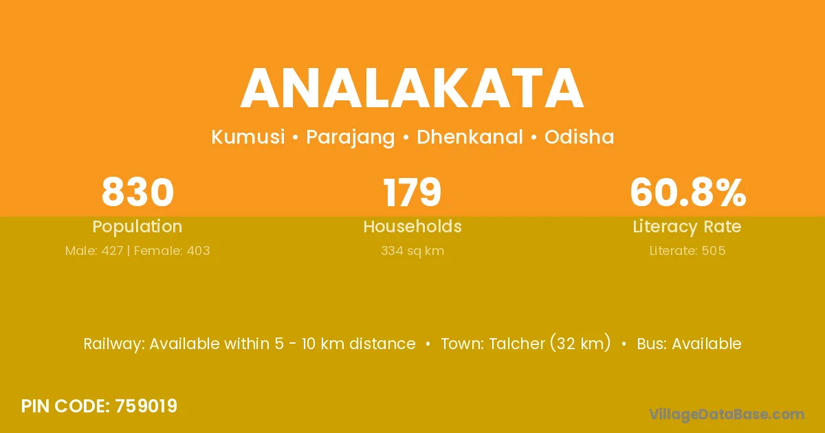 Talcher (32 km) is the nearest town to Analakata village for major economic activities and is located approximately 32 km away.
