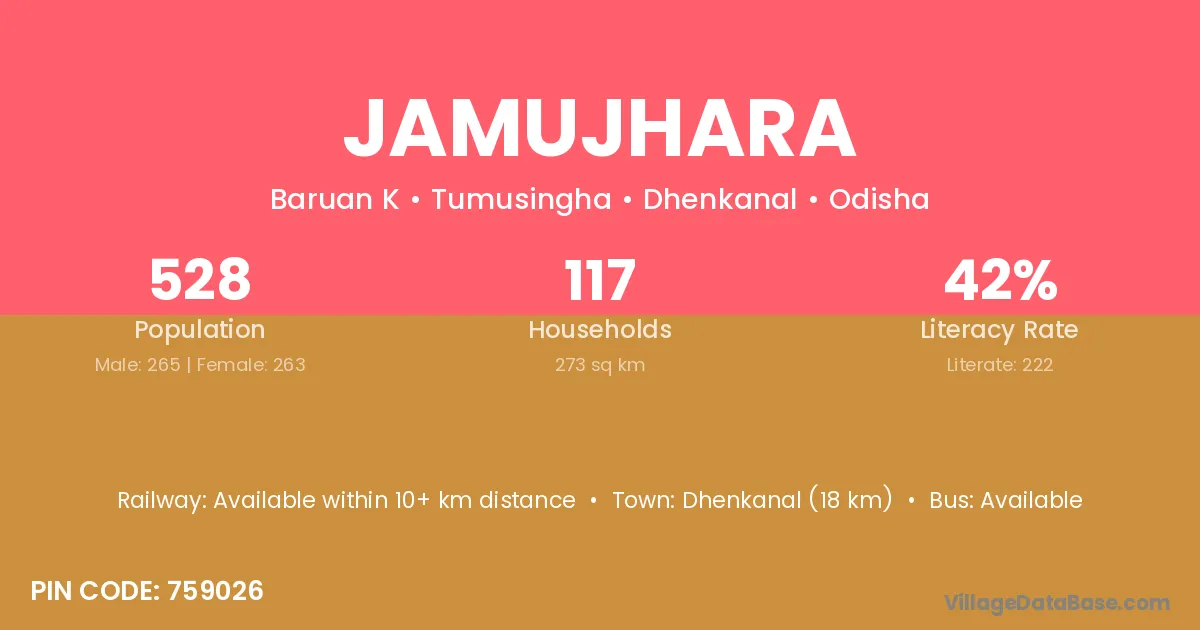 Dhenkanal (18 km) is the nearest town to Jamujhara village for major economic activities and is located approximately 18 km away.
