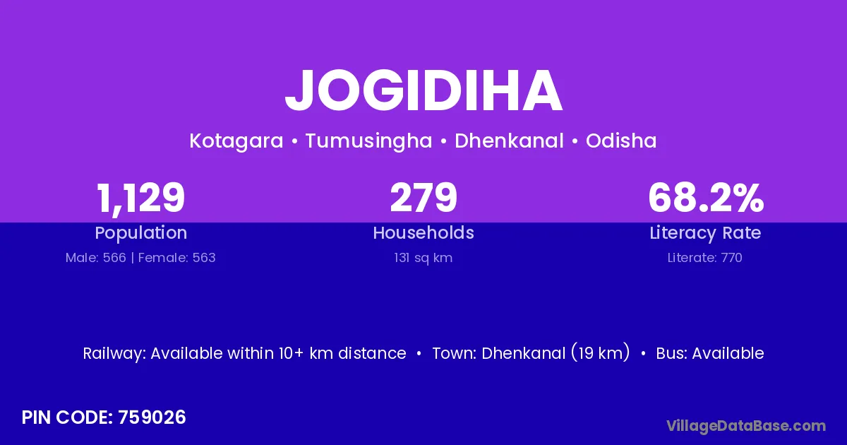 Dhenkanal (19 km) is the nearest town to Jogidiha village for major economic activities and is located approximately 19 km away.