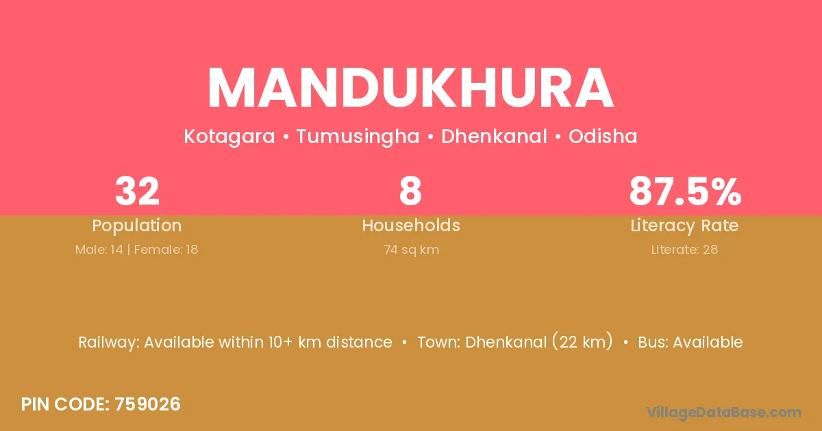 Dhenkanal (22 km) is the nearest town to Mandukhura village for major economic activities and is located approximately 22 km away.