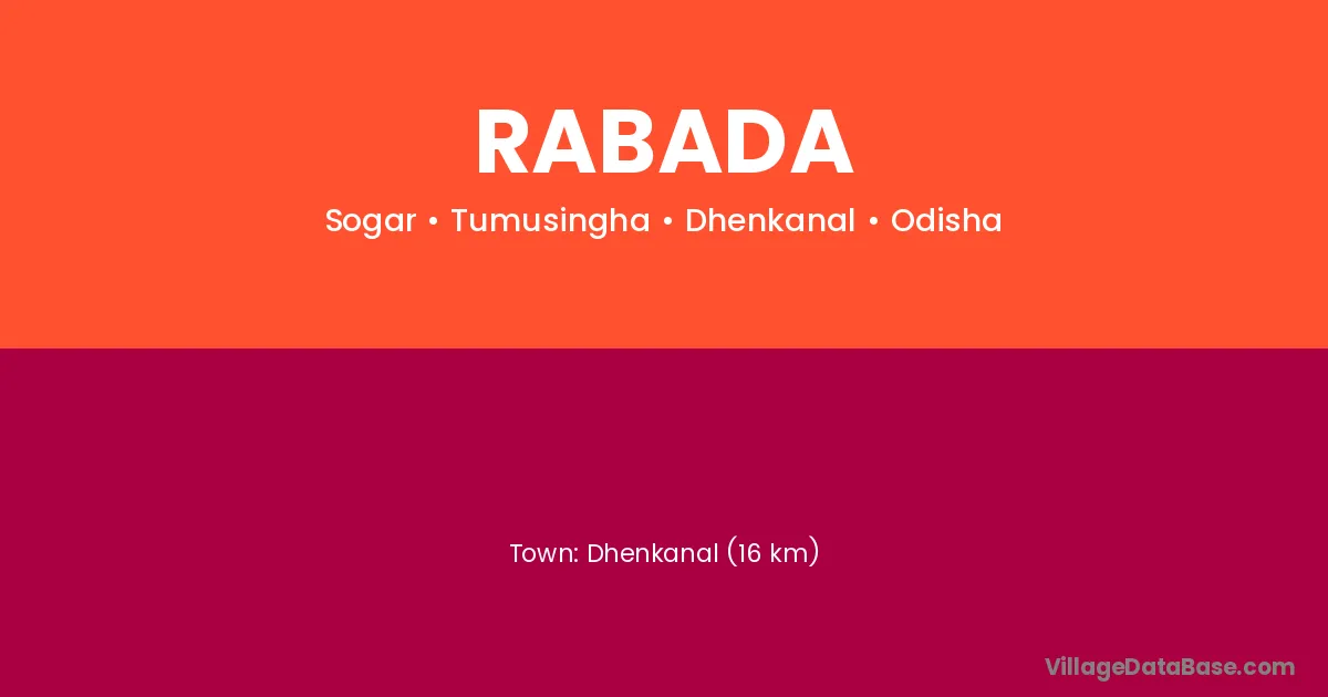 Dhenkanal (16 km) is the nearest town to Rabada village for major economic activities and is located approximately 16 km away.