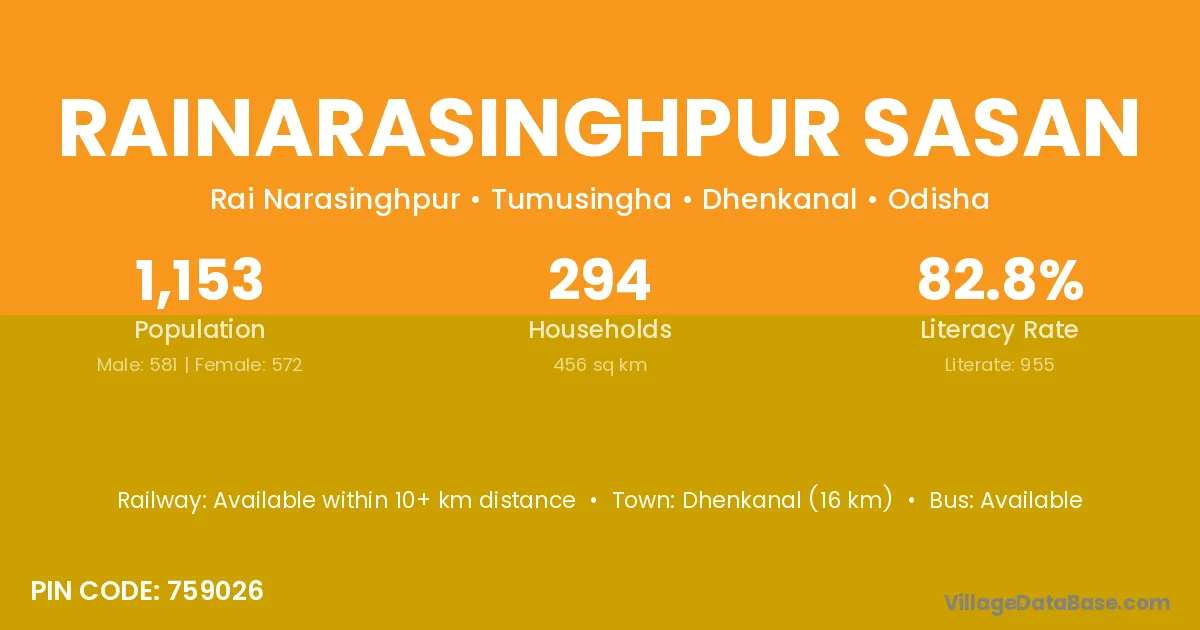 Dhenkanal (16 km) is the nearest town to Rainarasinghpur Sasan village for major economic activities and is located approximately 16 km away.