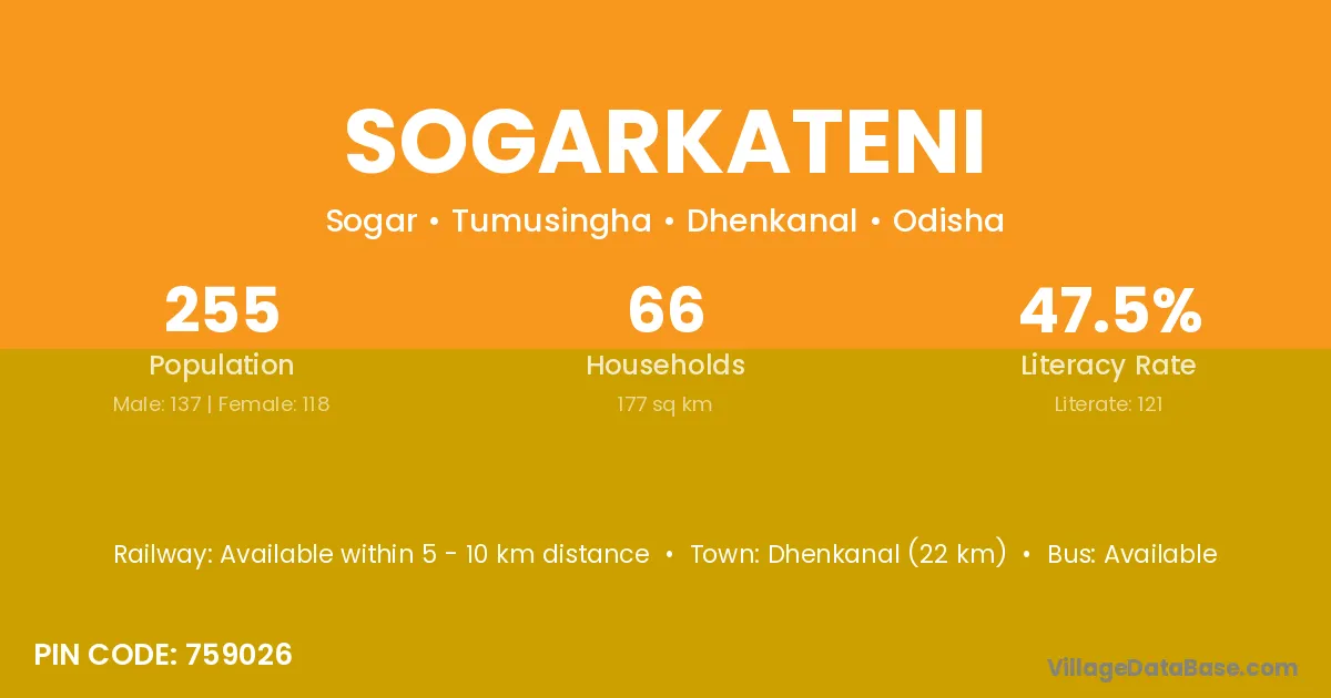 Dhenkanal (22 km) is the nearest town to Sogarkateni village for major economic activities and is located approximately 22 km away.