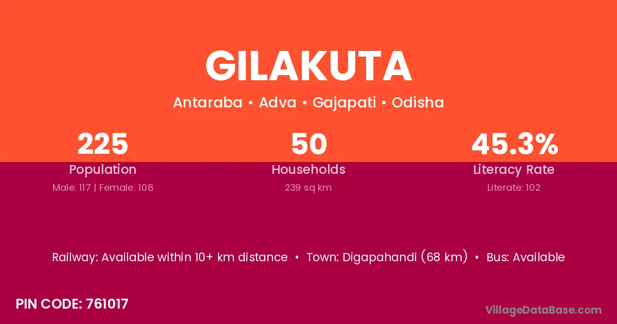Gilakuta village has a total population of 225 people, of which 117 are males and 108 are females.