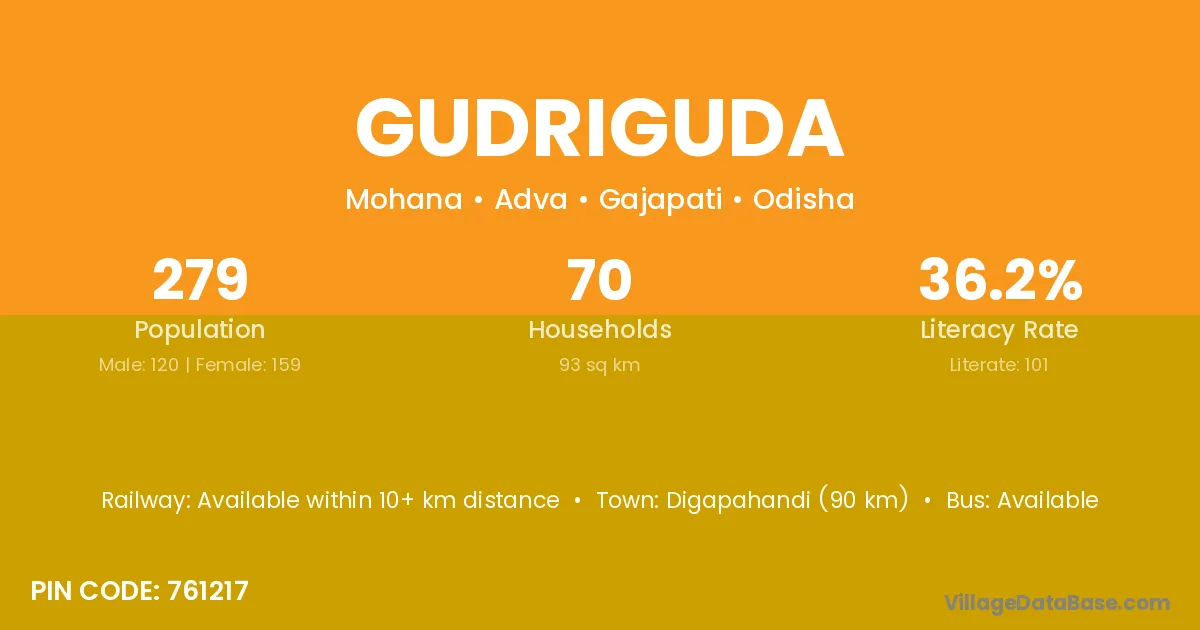 Digapahandi (90 km) is the nearest town to Gudriguda village for major economic activities and is located approximately 90 km away.