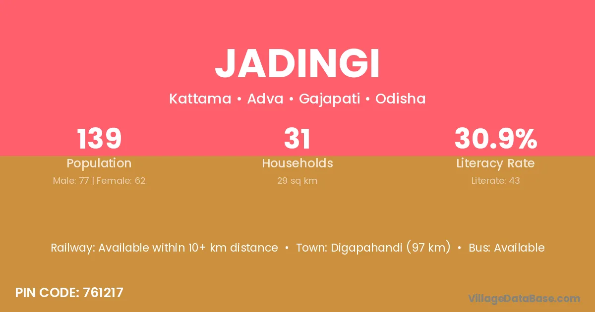 Digapahandi (97 km) is the nearest town to Jadingi village for major economic activities and is located approximately 97 km away.