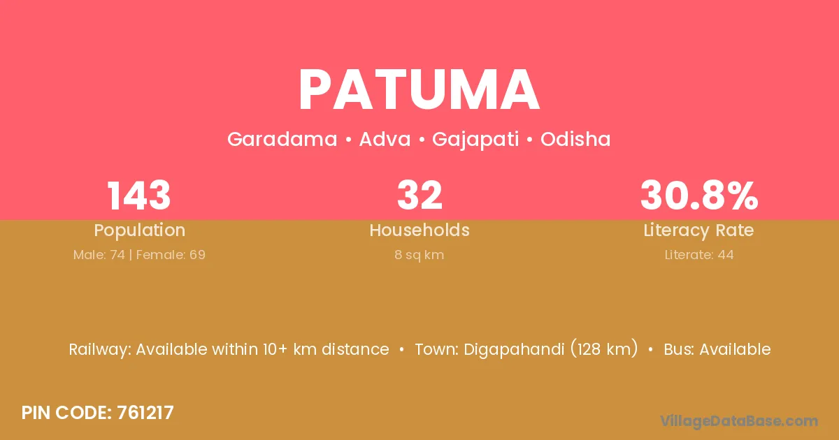 Digapahandi (128 km) is the nearest town to Patuma village for major economic activities and is located approximately 128 km away.