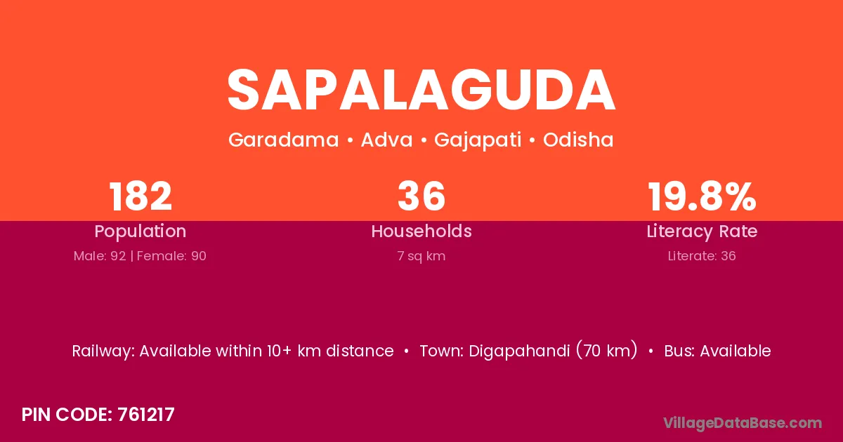 Digapahandi (70 km) is the nearest town to Sapalaguda village for major economic activities and is located approximately 70 km away.