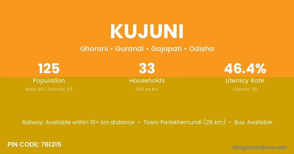 Parlakhemundi (26 km) is the nearest town to Kujuni village for major economic activities and is located approximately 26 km away.