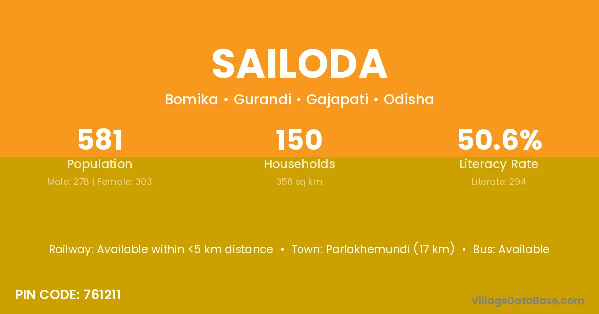 Parlakhemundi (17 km) is the nearest town to Sailoda village for major economic activities and is located approximately 17 km away.