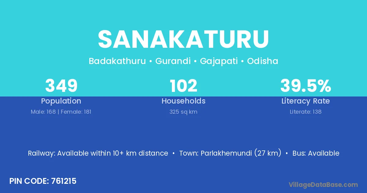 Parlakhemundi (27 km) is the nearest town to Sanakaturu village for major economic activities and is located approximately 27 km away.