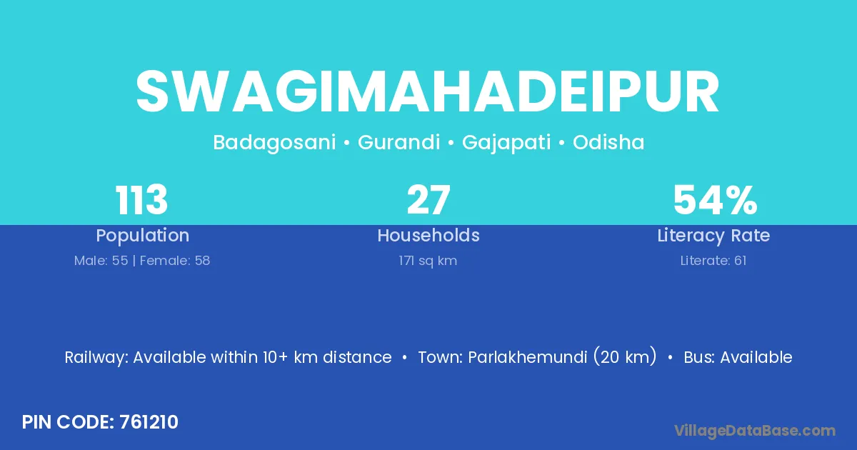 Parlakhemundi (20 km) is the nearest town to Swagimahadeipur village for major economic activities and is located approximately 20 km away.
