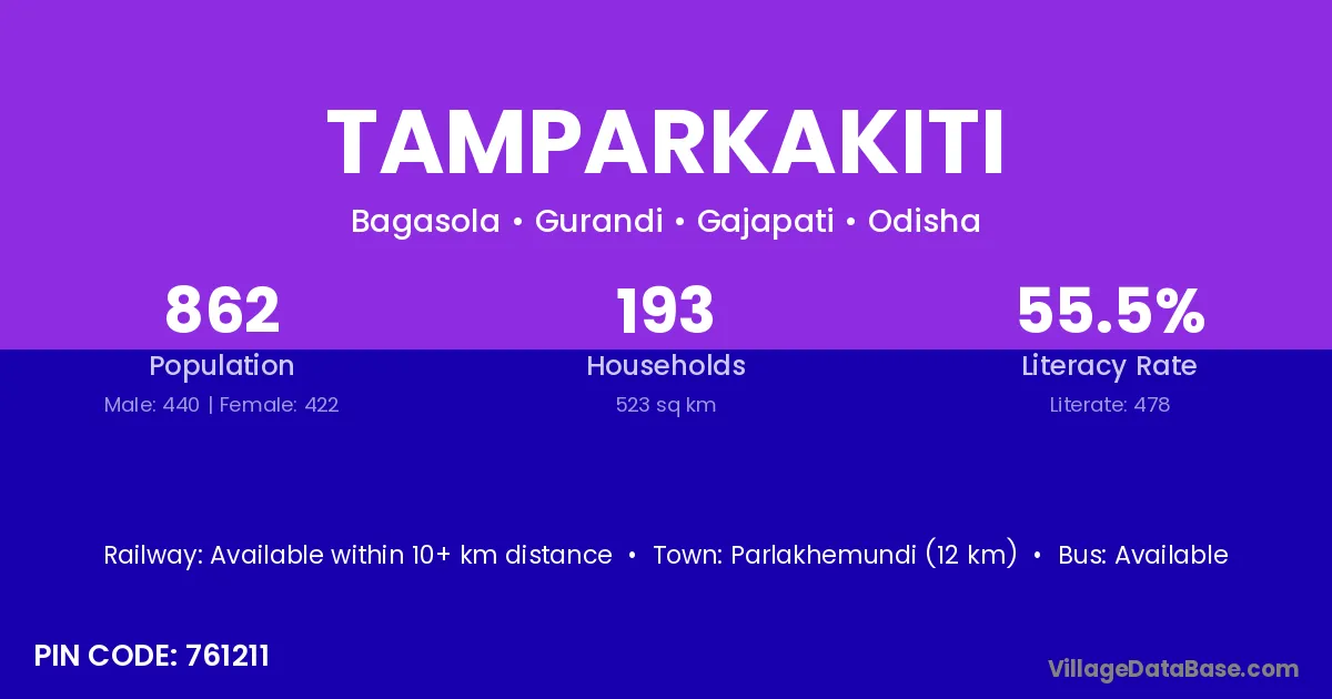 Parlakhemundi (12 km) is the nearest town to Tamparkakiti village for major economic activities and is located approximately 12 km away.