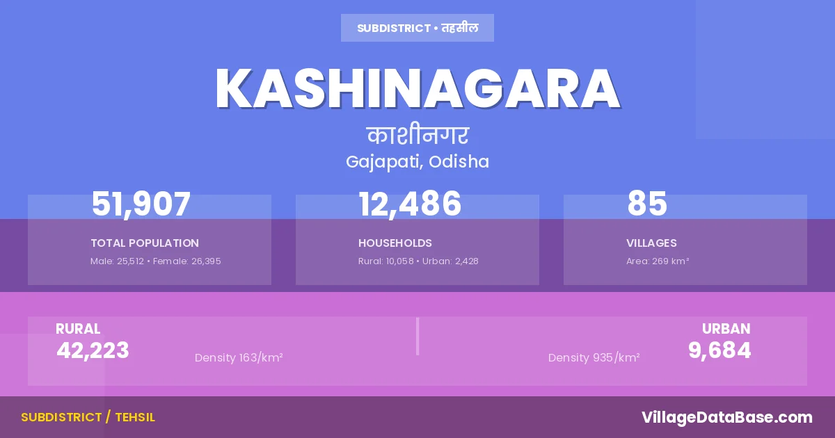 According to the 2011 census The total area of Kashinagara Tehsil is 269 km², with a population of 51907 people. The population density is 193 inhabitants per square kilometre, and there are approximately 12486 houses in the sub district.