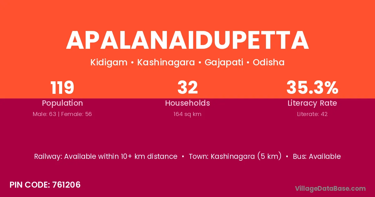 Apalanaidupetta village has a total population of 119 people, of which 63 are males and 56 are females.