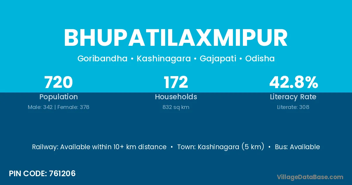 Kashinagara (5 km) is the nearest town to Bhupatilaxmipur village for major economic activities and is located approximately 5 km away.