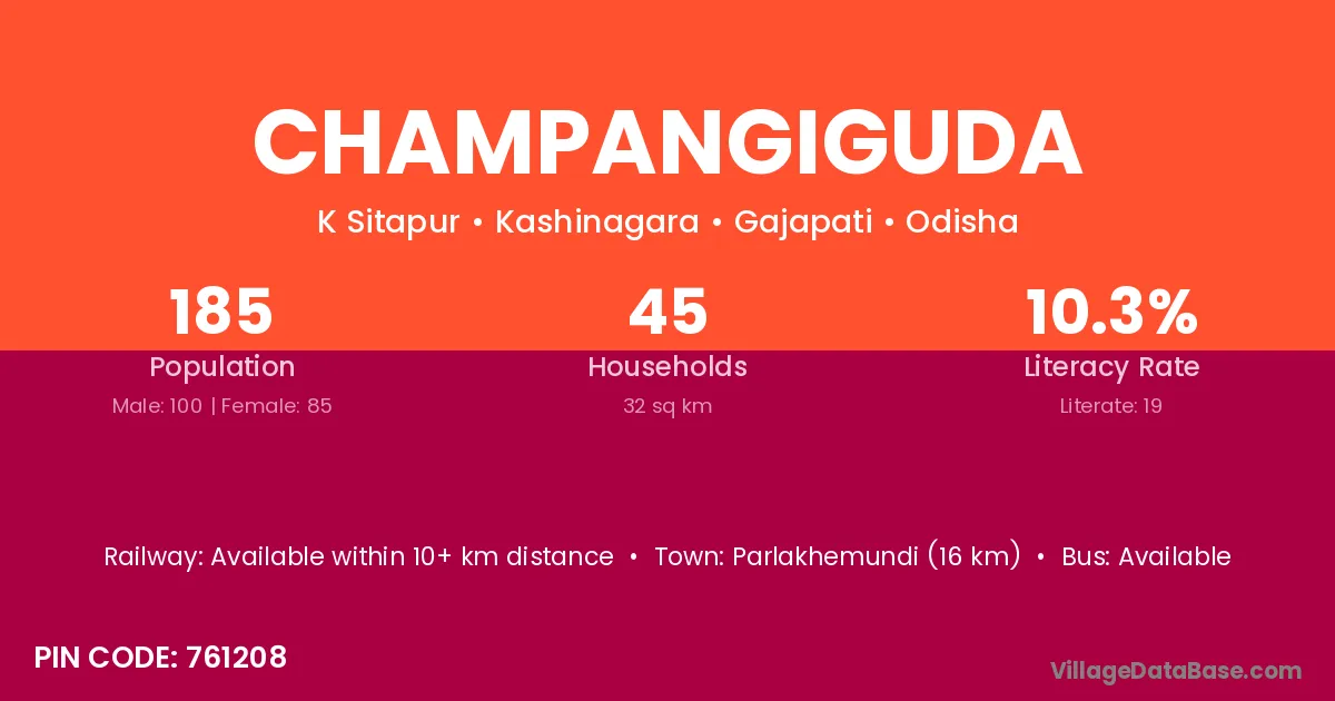 Parlakhemundi (16 km) is the nearest town to Champangiguda village for major economic activities and is located approximately 16 km away.