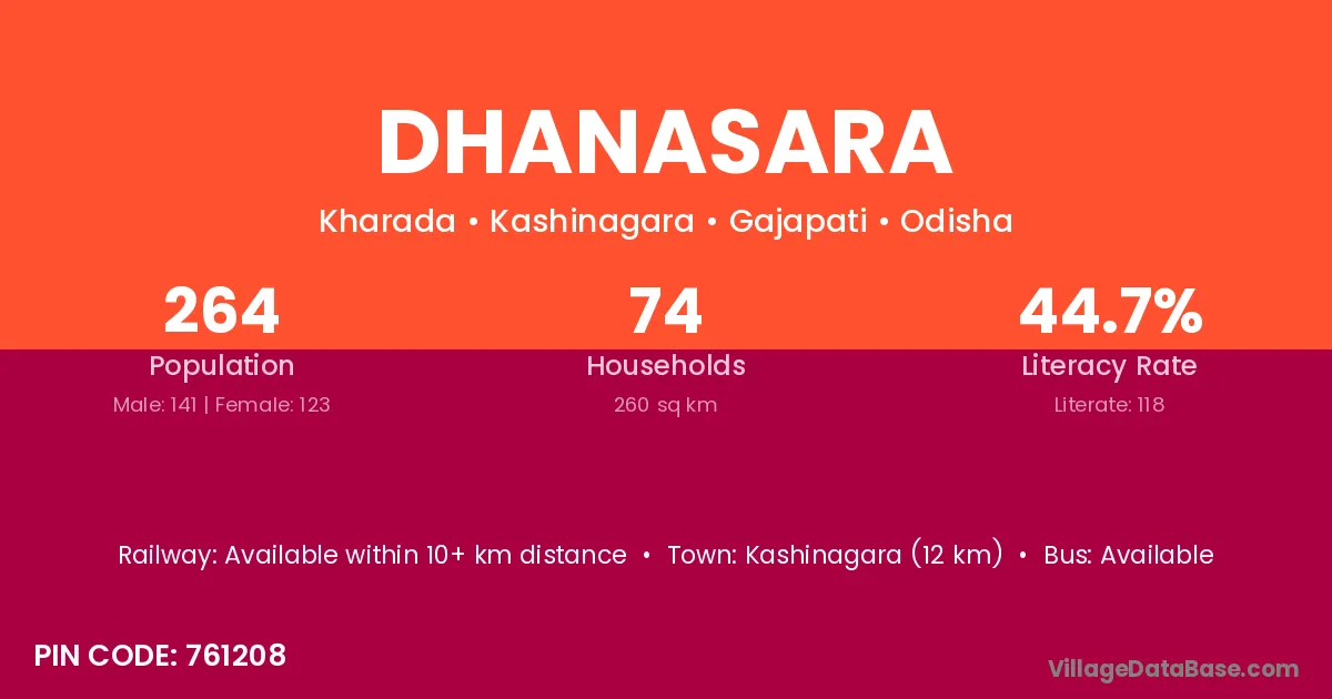 Dhanasara village has a total population of 264 people, of which 141 are males and 123 are females.