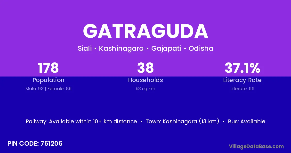 Kashinagara (13 km) is the nearest town to Gatraguda village for major economic activities and is located approximately 13 km away.