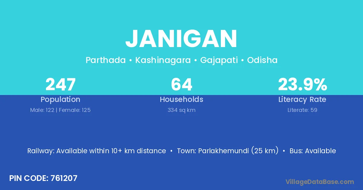 Parlakhemundi (25 km) is the nearest town to Janigan village for major economic activities and is located approximately 25 km away.