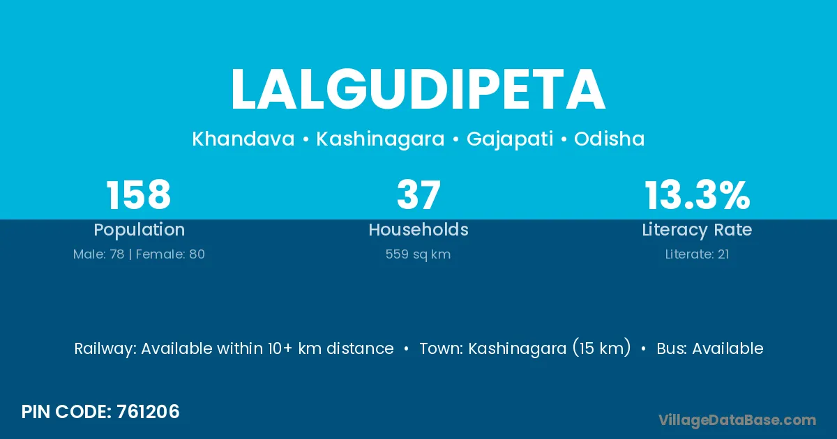 Kashinagara (15 km) is the nearest town to Lalgudipeta village for major economic activities and is located approximately 15 km away.