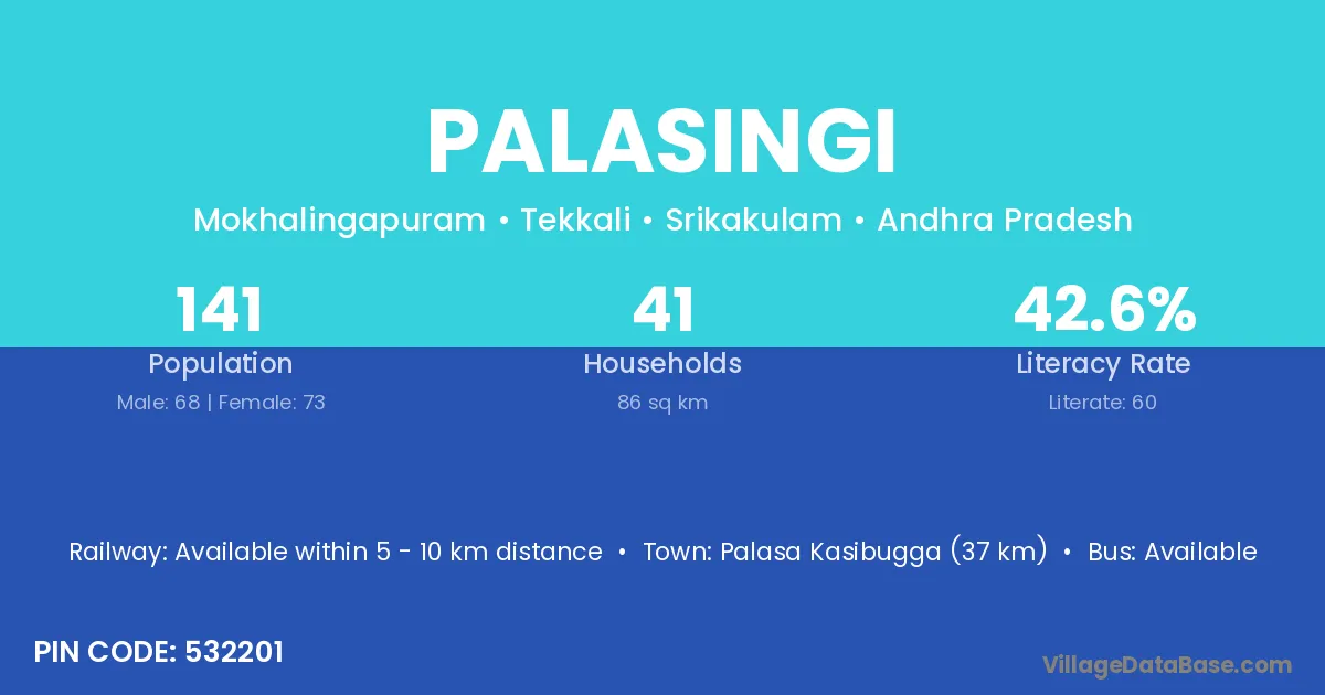 The literacy rate of Palasingi village is 38.44%. Male literacy stands at 46.84% and female literacy at 30.25%.