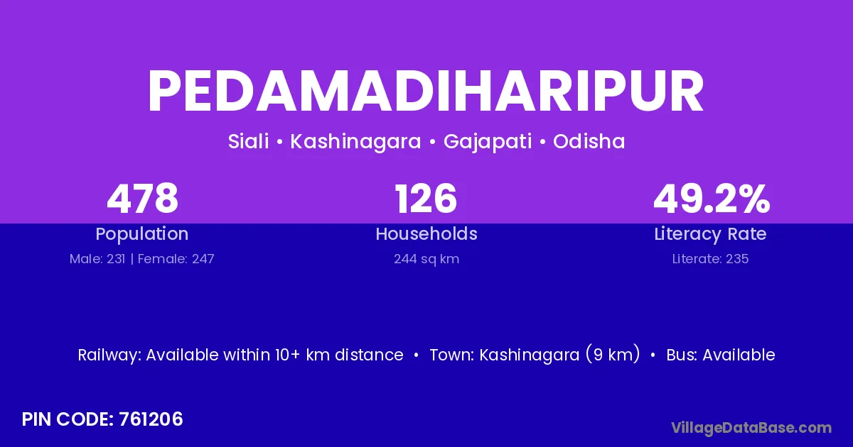Pedamadiharipur village has a total population of 478 people, of which 231 are males and 247 are females.