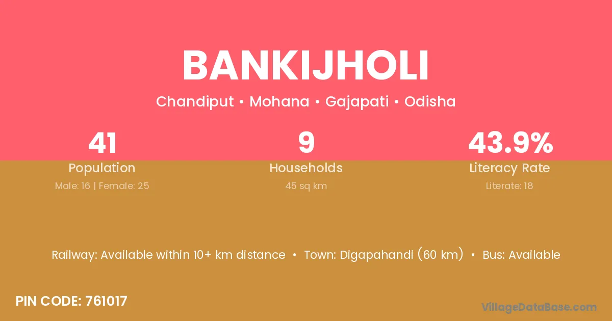 Bankijholi village has a total population of 41 people, of which 16 are males and 25 are females.