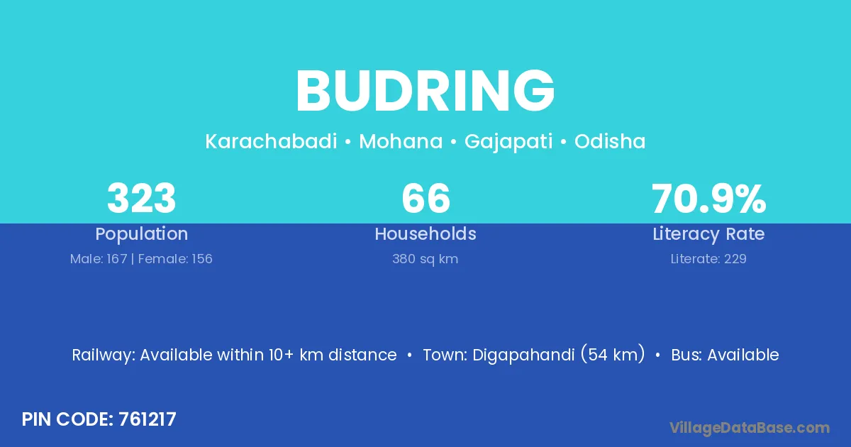 Digapahandi (54 km) is the nearest town to Budring village for major economic activities and is located approximately 54 km away.