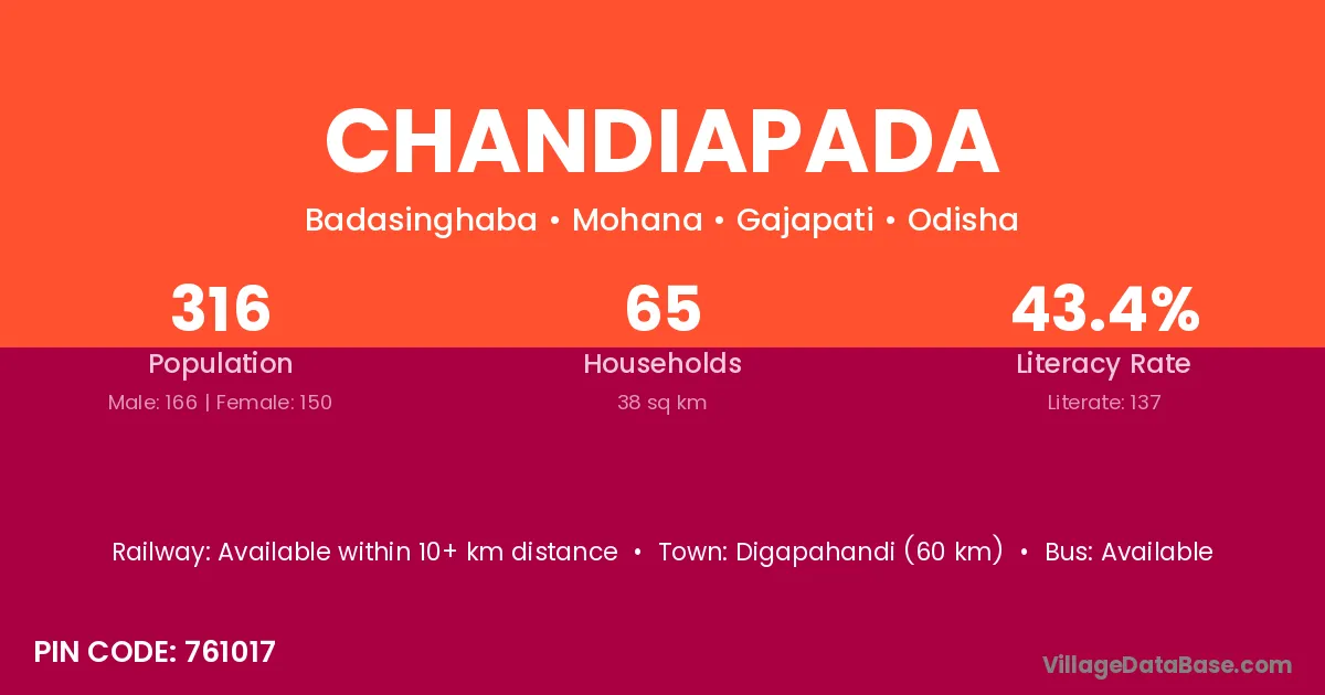 Chandiapada village has a total population of 316 people, of which 166 are males and 150 are females.