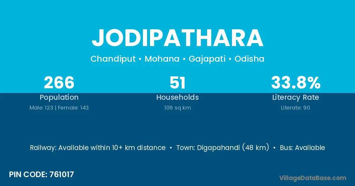 Digapahandi (48 km) is the nearest town to Jodipathara village for major economic activities and is located approximately 48 km away.