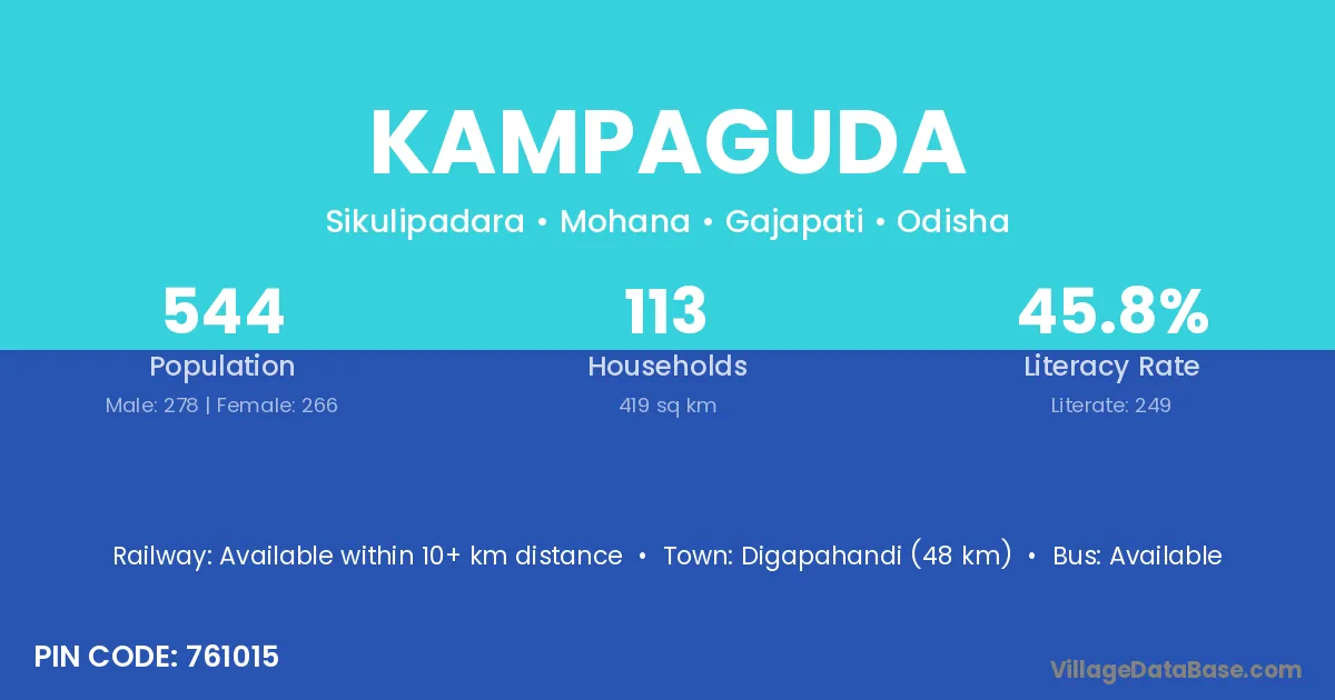 Digapahandi (48 km) is the nearest town to Kampaguda village for major economic activities and is located approximately 48 km away.
